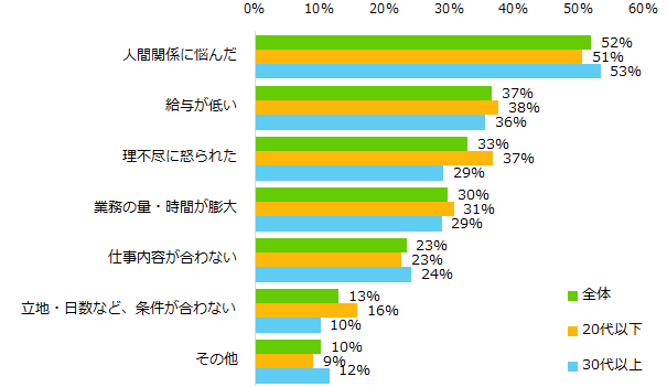 退職した理由は、長時間労働・人間関係・賃金などへのストレス